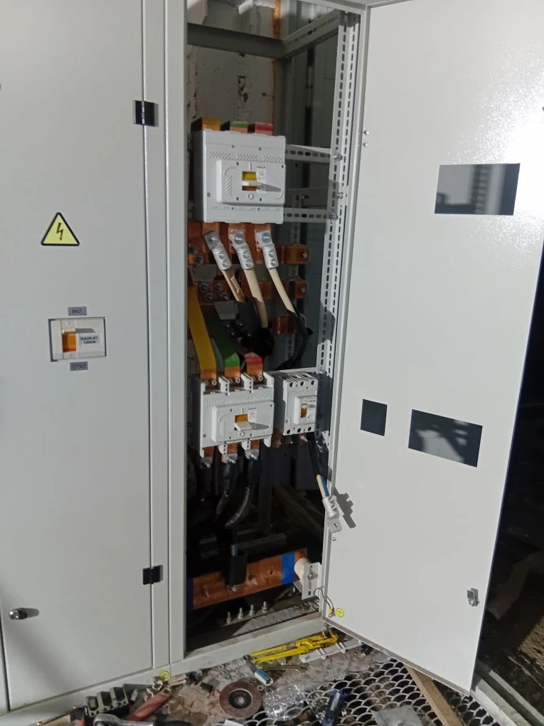 В распределительных ячейках подключили кабель ВВГ 4х240. Предварительно на кабель усадили перчатку и опрессовали болтовыми наконечниками