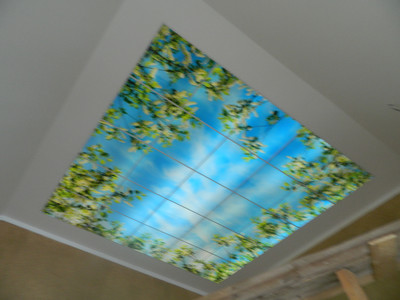 Светодиодная подсветка такого потолка выполнена с помощью ленты. Подвесной потолок с подсветкой смонтирован из стеклянных панелей.
