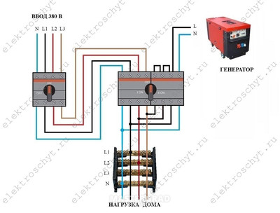 При подборе трехпозиционного переключателя следует учитывать ток, который будет протекать через него. Исходить следует из мощности генератора. Так, например, если ваш генератор выдает мощность 5 КВт, то при максимальной нагрузке через рубильник будет протекать ток равный 22,5 Ампера.